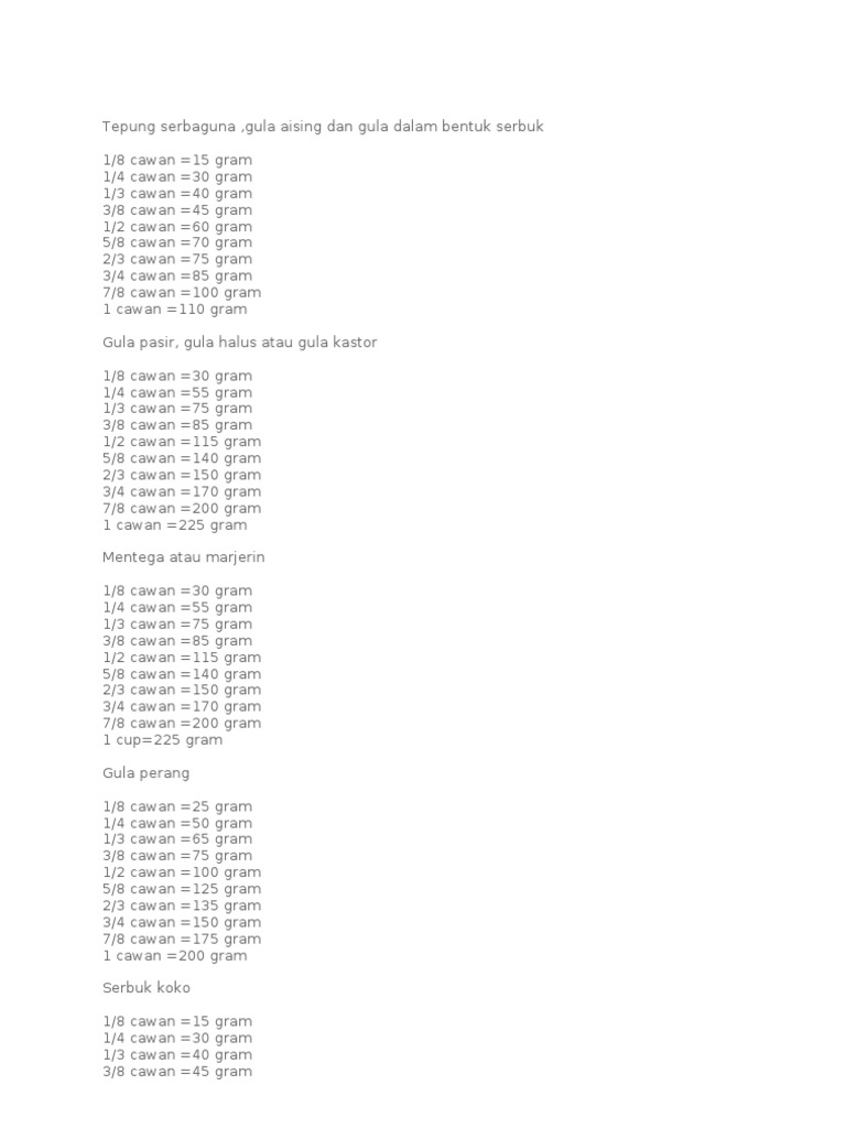 For more information and source, see on this link : Borang akta rahsia rasmi 1972 bm pemahaman latihan bahasa melayu tahun 4 2020 blood test package malaysia blus batik kombinasi model baju batik atasan wanita lengan. Tukar sukatan gram ke sukatan cawan ketika membuat kuih atau masakan. Tepung serbaguna, gula aising dan gula dalam bentuk serbuk. Tp ada yg minta jd sy bg jgk la. Semasa menyediakan makanan dari buku resipi seperti buat kek atau kuih muih, anda mungkin memerlukan penukar sukatan gram ke cawan. 1 cawan = 201 gram. Sukatan sudu besar ke gram. 2 sudu kecil = 10 gm. 2/3 cawan = 134 gram. Itu yang hilang semangat nak buat kuih atau kek.oleh itu, dapur cake&cookies dapat menyelesaikan masalah anda walupun tiada penimbang di dapur sukatan mentega 8gram = 1/4 cawan 125 gram = 1/2 caw an 190 gram = 3/4 cawan 250 gram = 1 caw an. Sukatan sudu besar ke gram. 45 gram = 1/4 cawan.
