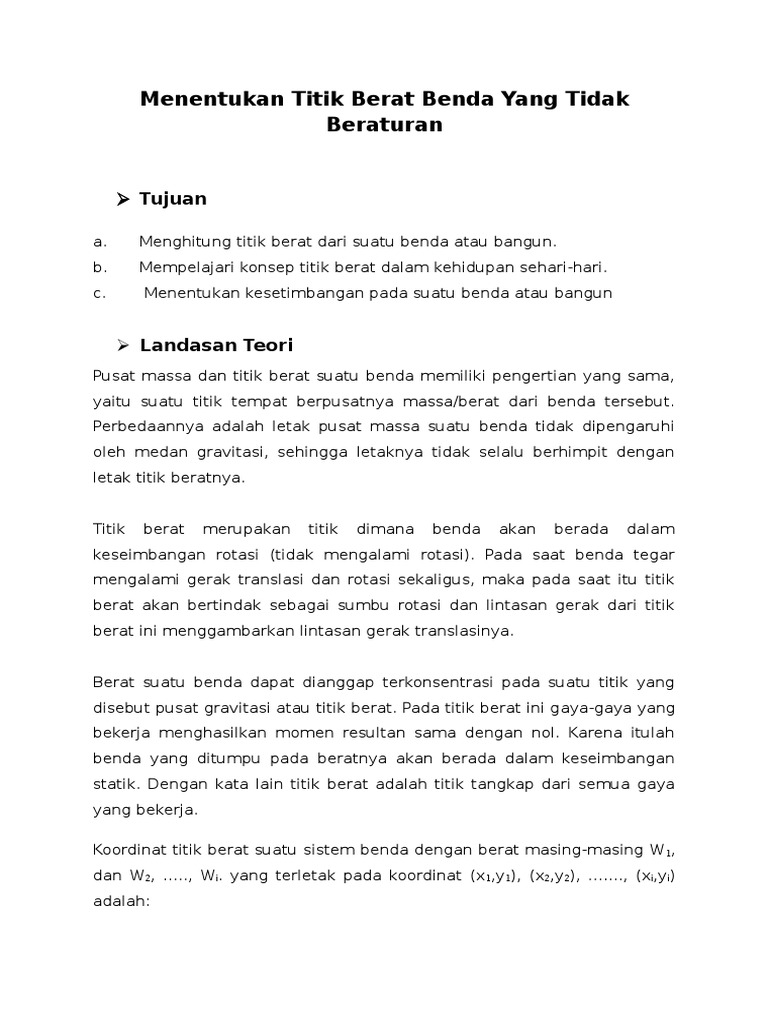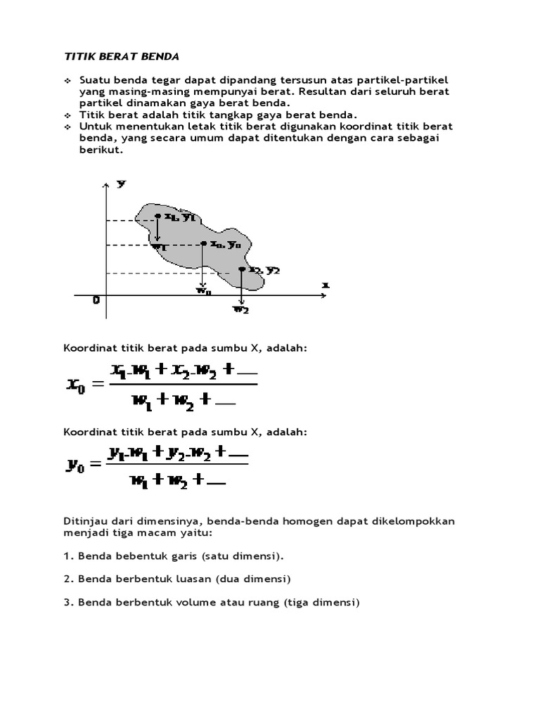 Benda ukurannya dapat diabaikan sehinggadapat digambarkan sebagai suatu titik materi, disebut partikel. Mencakup titik berat gabungan benda berupa panjang, luasan, volume dengan beberapa contoh bentuk segitiga, persegi, persegi panjang, tabung koordinat titik berat gabungan keenam kawat (x0 , y0). Wondering what the indonesian word for berat is? Gerak yang terjadi pada partikel hanyalah gerak translasi. Titik berat badan anda dipengaruhi oleh genetika dan kecenderungan biologis, namun dapat diubah oleh aktivitas dan perilaku.