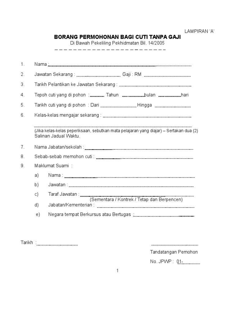 ** permohonan kemudahan cuti tanpa rekod bagi menduduki peperiksaan, kini boleh dibuat dengan mengisi borang cuti tanpa rekod yang disediakan seperti di lampiran. · kenyataan cuti seperti cuti. Tuan, permohonan cuti tanpa gaji di bawah perintah am bab c 14 pekeliling perkhidmatan 5/94 dan pekeliling perkhidmatan 9/91 perenggan 58(1) a. Si kakak dah ada adik. Pekeliling ini berkuatkuasa pada 1 januari 2018.